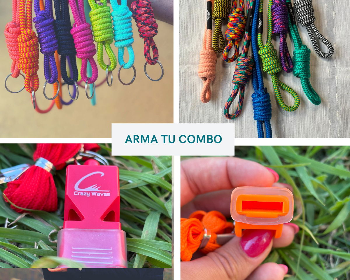 Este combo incluye cuerda de polipropileno 6mm (roja, verde manzana, negra, fucsia, serpiente coral, amarilla y rojo rayado, verde agua, naranja) y un silbato Crazy Waves (rosa, rojo, negro, azul, verde, naranja y amarillo). Podes combinarlos como prefieras y asi poder trabajar con comodidad y eficacia🌊⛑️🤩